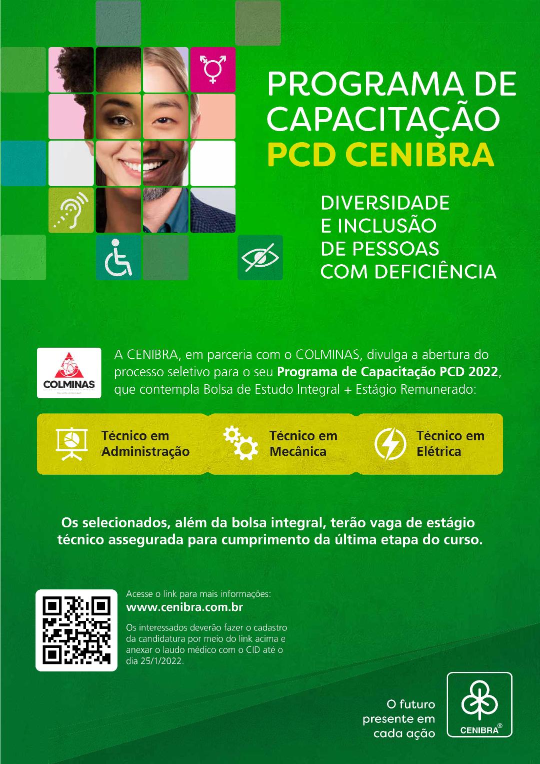 Comprometida com políticas de diversidade e inclusão, a CENIBRA informa que deu início ao processo seletivo para a qualificação profissional de pessoas com deficiência (PCD). A iniciativa faz parte do Programa de Capacitação PCD 2022, uma parceria com o Colégio Técnico do Leste Mineiro (Colminas).![]()