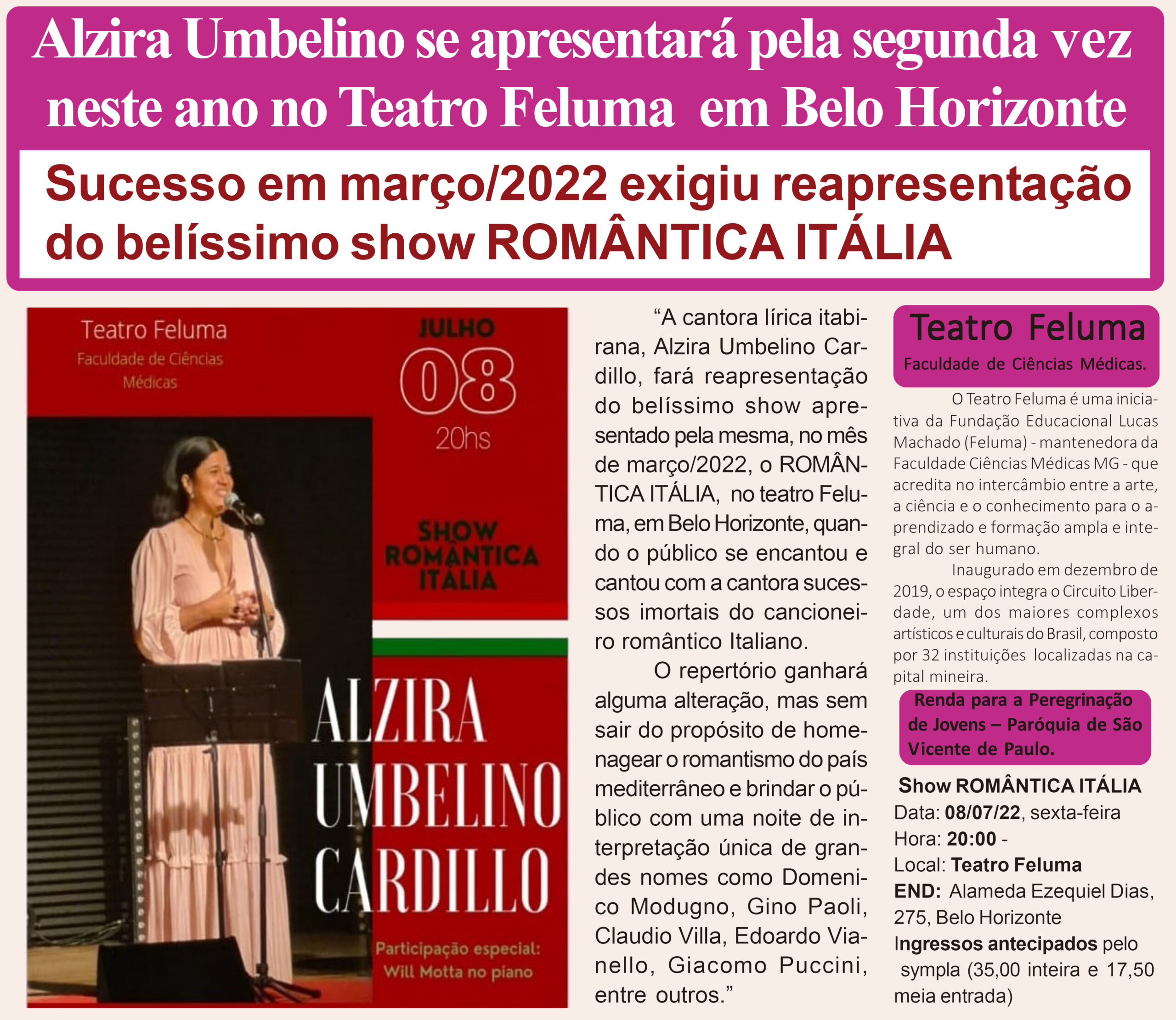 Alzira Umbelino se apresentará pela segunda vez neste ano no Teatro Feluma em Belo Horizonte 05/07/2022 FacebookTwitterWhatsApp