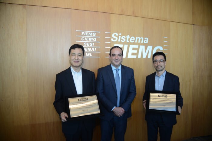 Nessa terça-feira (4/7), o CEO do Grupo Oji e Presidente da Oji Holdings, Hiroyuki Isono, e o Diretor-Presidente Executivo da CENIBRA, Takashi Nakajima, estiveram na sede da FIEMG e receberam das mãos do Presidente da federação, Flávio Roscoe, uma placa de homenagem pelo aniversário das empresas. Neste ano, a Oji Holding completa 150 anos e a CENIBRA 50. A honraria se deu pela atuação e efetiva contribuição das empresas para o desenvolvimento econômico e social de Minas Gerais e do Brasil.