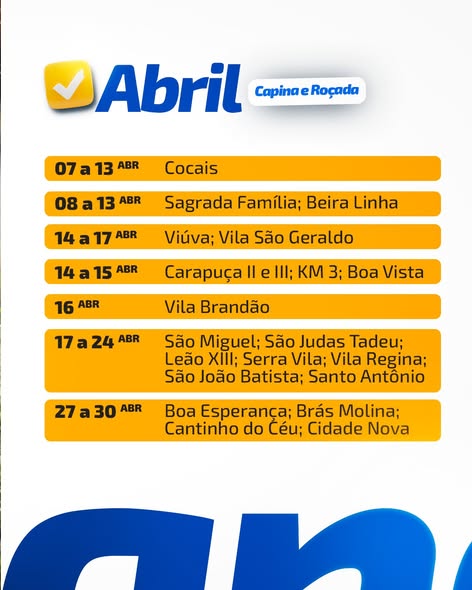 A cidade segue avançando com cuidado e organização. Confira o cronograma de limpeza urbana de abril e acompanhe quando os serviços de capina e roçada chegam ao seu bairro. Um trabalho contínuo que contribui para uma Barão de Cocais mais limpa, segura e bem cuidada.