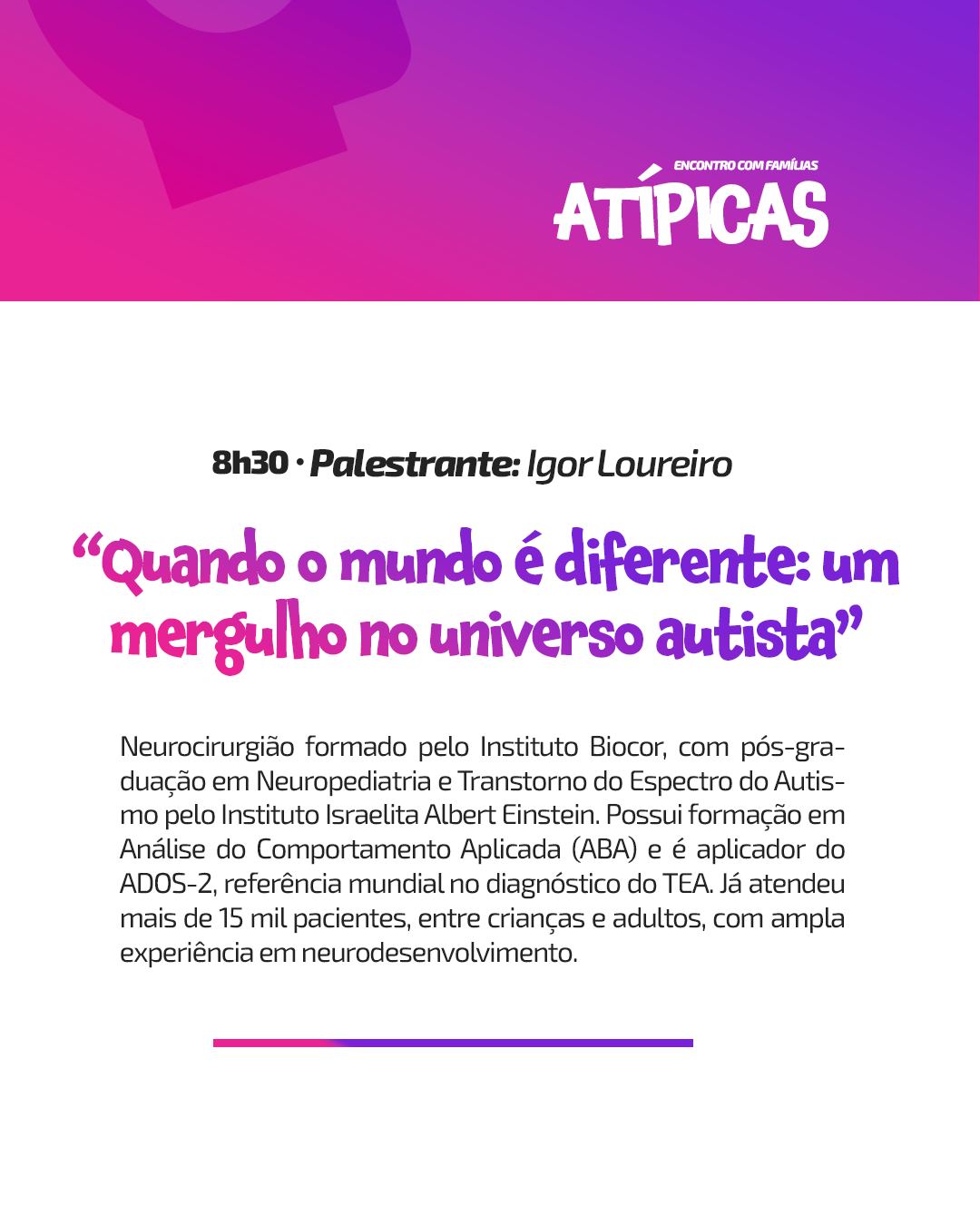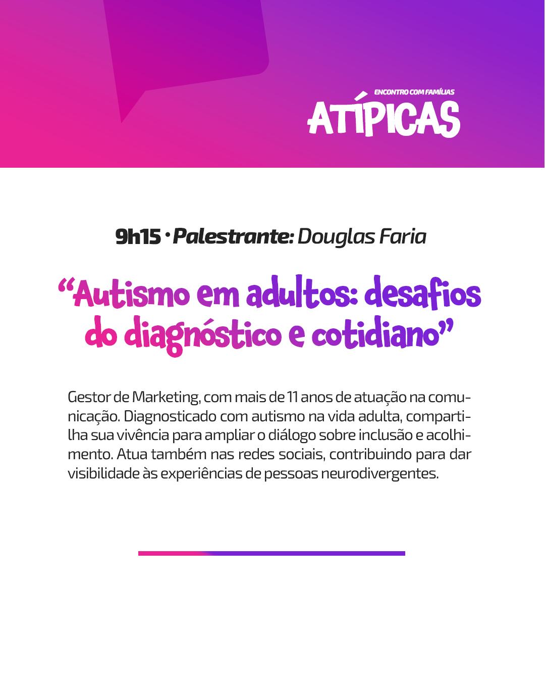 Entre os destaques, estão a participação do Dr. Igor Loureiro, com uma palestra sobre o universo autista, e Douglas Faria, que vai compartilhar vivências sobre o autismo na vida adulta.